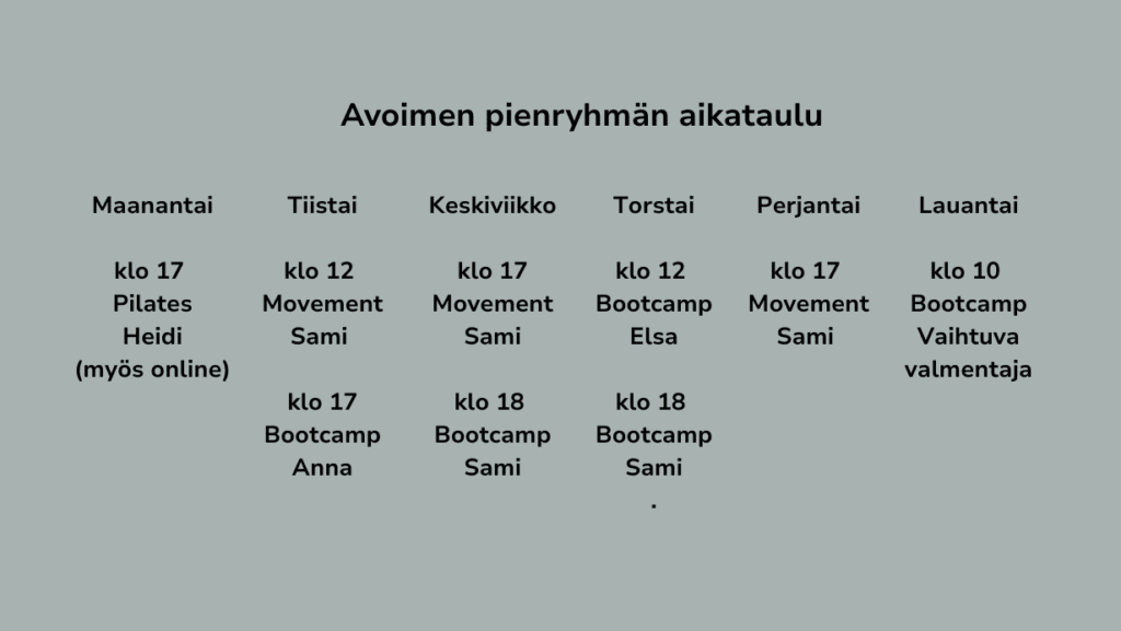 - Viikoittain useita eri tunteja (bootcamp, movement, jooga, pilates)